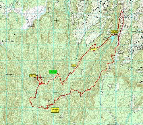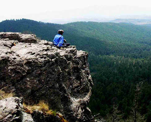 | A las 3:30 p.m. comenzamos la bajada, y al llegar al camino por el que llegamos, surgió la idea de bajar por el otro lado. Hicimos caso a la idea y comenzamos a bajar por vereda en dirección opuesta a nuestra llegada ¡1er ERROR!, confiábamos en que el camino daría vuelta en dirección correcta y así fue. El cielo comenzó a cerrase con nubes de “probable lluvia” y apresuramos en lo posible el paso, pues ya el cansancio era cada vez más notorio y la motivación que nos llevó a la cima ahora comenzaba a ser desesperación por llegar a los coches sanos y secos “2do ERROR” Por la desesperación no consultamos los GPS para planear mejor el regreso. Comenzamos a subir de nuevo hasta llegar a una elevación muy parecida a la Bufa (3,500 mts), pero a una cañada de diferencia, eso nos desconcertó mas, eran ya las 5:00 p.m. y comenzaba la lluvia tipo chipichipi, lo cual aumentó la desesperación del grupo. | ![]() |
