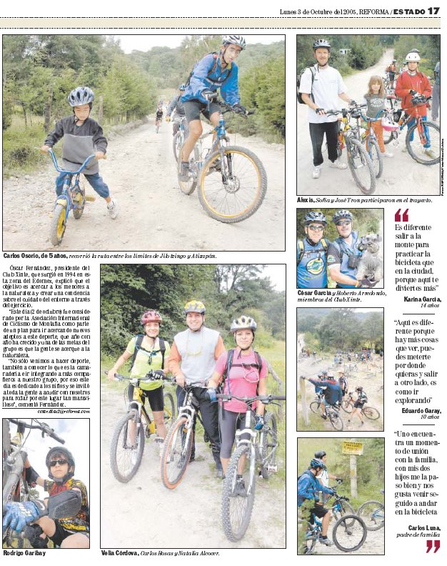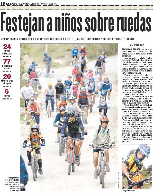 Octubre 2, 2005: Con 77 participantes y sobrepasando por mucho la asistencia del año pasado este Domingo 2 de Octubre llevamos a cabo el Take a Kid Mountain Biking Day 2005, el cual organiza IMBA a nivel mundial con todos sus clubes afiliados a nivel mundial. Este proyecto ha sido un éxito y en los Estados Unidos IMBA ha llegado hasta el congreso y el senado para darle la importancia que este suceso tiene.