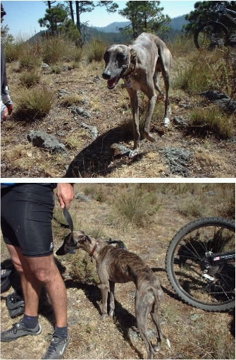 bajada en recorridos de hasta de 60 Km. El aspecto de la raza del Galgo es flaca, encorvado y para algunos antiestético como cuando pasamos por algún poblado, los niños con frecuencia mencionan “pobrecito perrito esta muy flaco” pero su diseño es para correr más rápido que cualquier otra raza. En los recorridos, no ataca a los perros de los rancheros, no se aleja del amo y por esto difícilmente ataca a los animales domésticos y respeta los alimentos de los Ciclomontañistas, en otras palabras tu torta esta a salvo y no te la arrebatara. Hasta hoy no habíamos conocido un perro con estas características tanto así que pasa desapercibido ya que no tienes que batallar. |