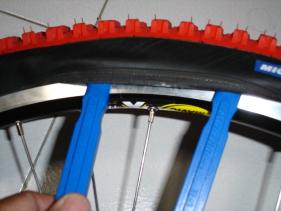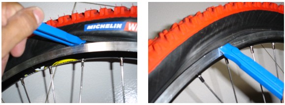 Para el desmontaje de la llanta lo mas recomendable es utilizar las conocidas espátulas de plástico o en su defecto también puedes usar el bloqueo de las mazas siempre y cuando este no presente bordes afilados. No es recomendable utilizar bajo ninguna circunstancia un desarmador metálico ya que podrías picar la cámara además de ocasionar daño a la pestaña del aro o rin.
