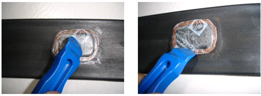 Dejamos que el parche se adhiera al pegamento y comenzamos a aplicar presión con la ayuda de la espátula de adentro hacia fuera y aplicando un poco de mas presión en los bordes del mismo.