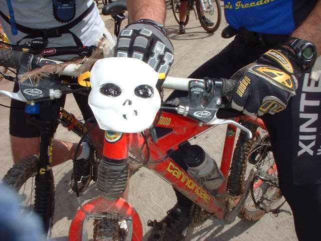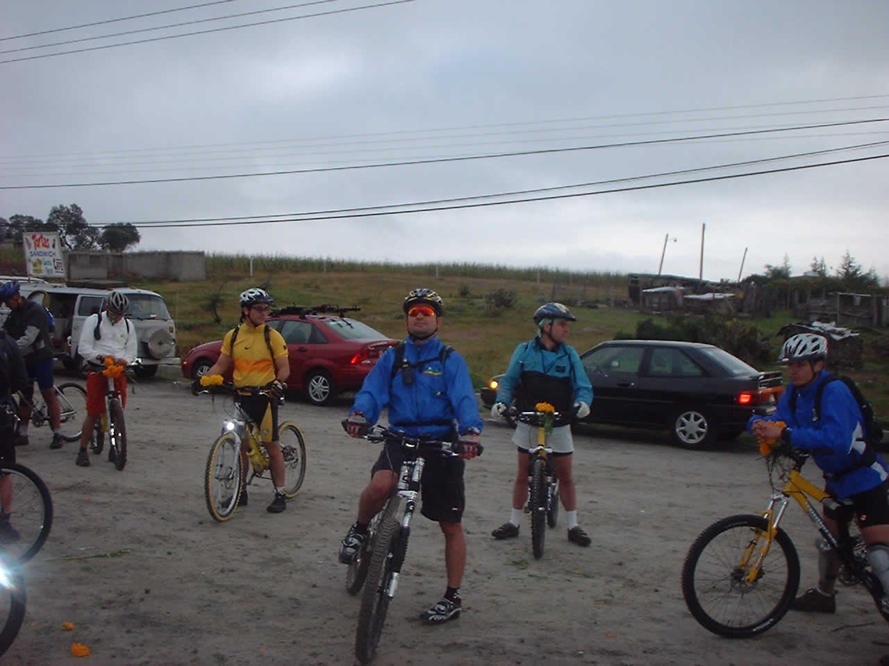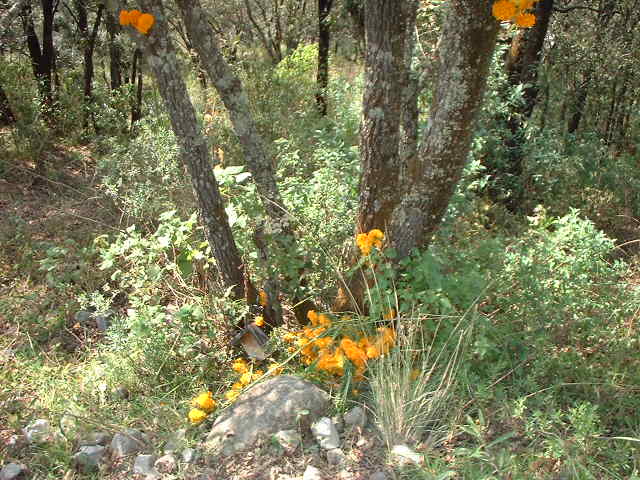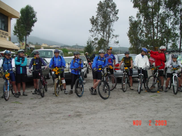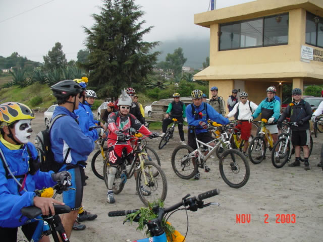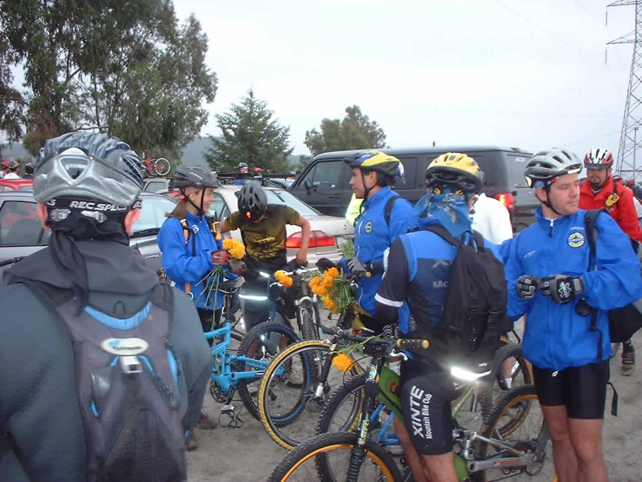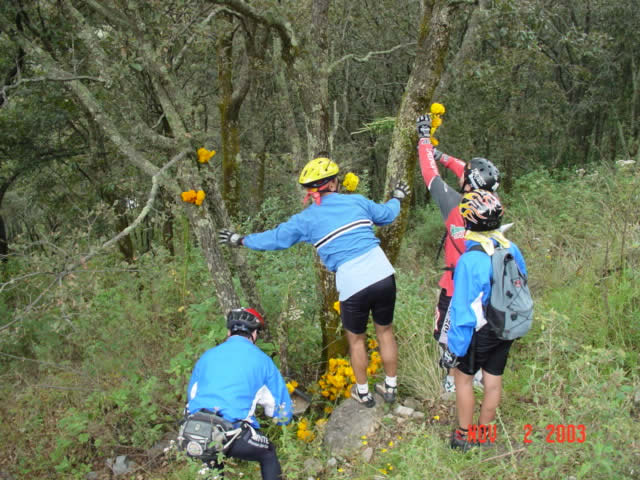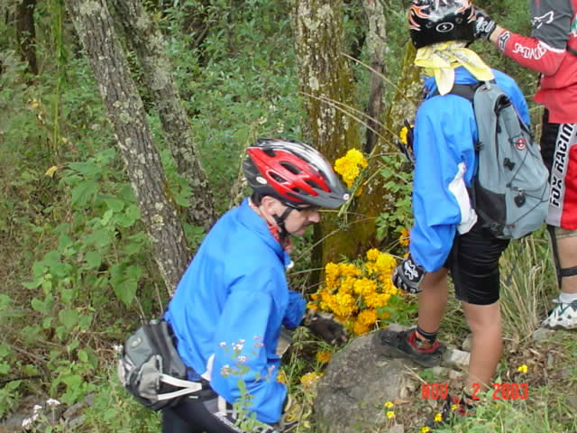 | Las bicis adornadas con flores de Cempazuchitl | Ofrenda de flores en el lugar donde Daniel + fallecio en le 2001 en la bajada "Las Eses" |