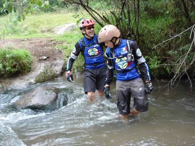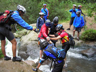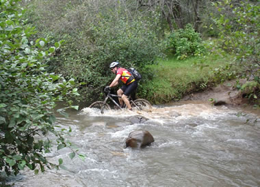 | Las ultimas lluvias de la temporada elevaron el nivel del río Xinte por lo que mojarse era inevitable ya fuera sobre la bici o sobre las rocas. | |